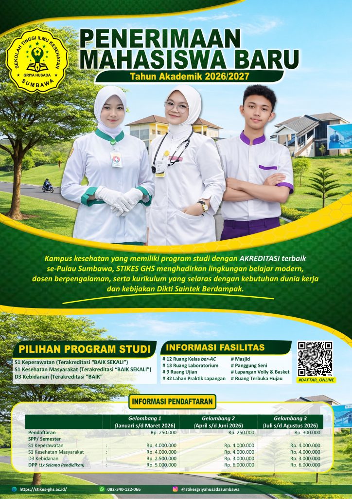 Penerimaan Mahasiswa Baru & Alih Jenjang (RPL)STIKES Griya Husada SumbawaTELAH DIBUKA TOR TES WAWANCARA Klik disini>>> Pengumuman Seleksi PMB Gelombang 2 Klik disini>>> Daftar Akun KIP-Kuliah Klik disini>>> Jalur Pendaftaran Reguler Alih Jenjang (RPL) Info Lebih LanjutWhatsapp: 082340122066 (Bid. Kemahasiswaan, Alumni dan Kerjasama STIKES Griya Husada Sumbawa)